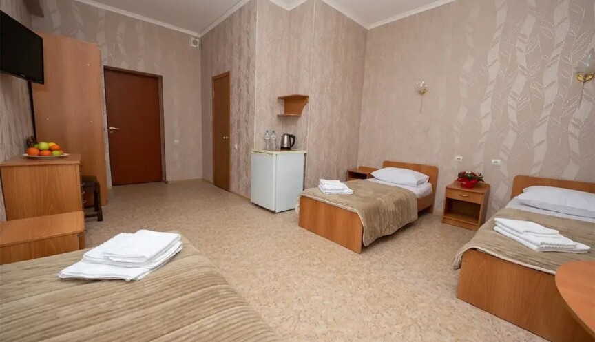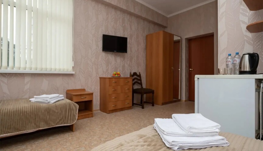 Уютный трехместный номер расположен в корпусе 9 и располагает всем необходимым для комфортного проживания. С балкона открывается прекрасный вид на величественные лесистые горы и парк. Номер эконом-класса площадью 35 кв.м включает в себя 3 односпальные кровати, кондиционер, холодильник и другие удобства.