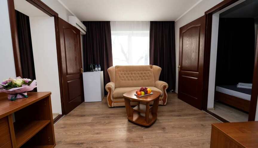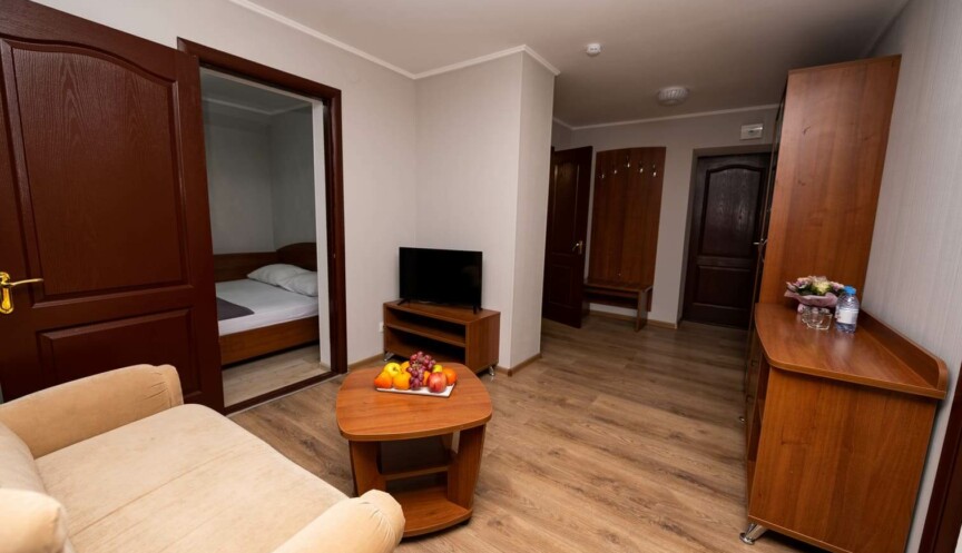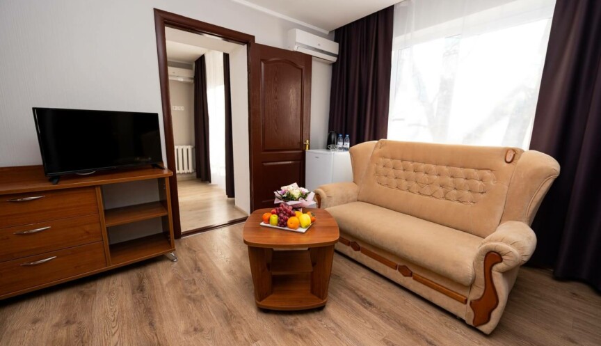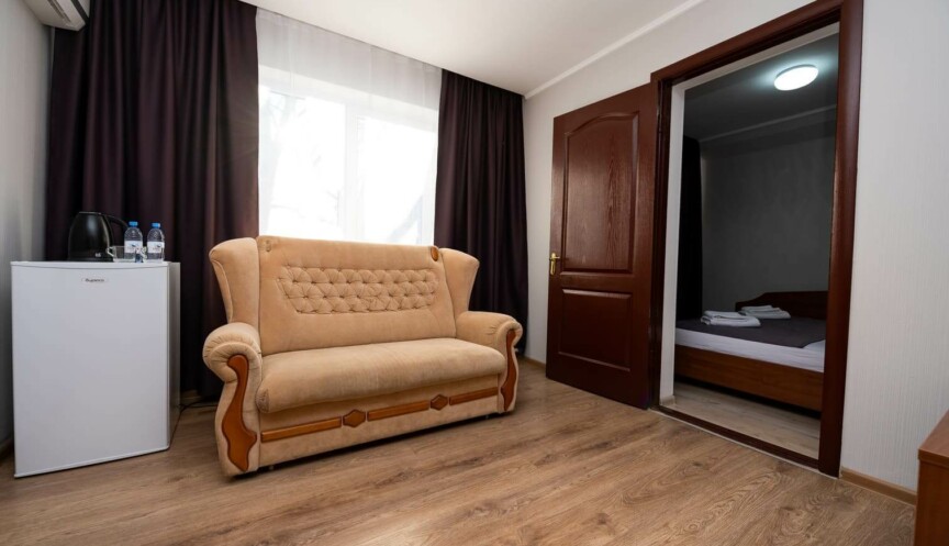 Трехкомнатный семейный номер площадью около 42 квадратных метров располагает 4 основными кроватями и 2 дополнительными кроватями, т.е. 2 двуспальными кроватями и 1 раскладным диваном. Кроме того, в номерах есть отдельная ванная комната, туалет, кондиционер, холодильник, телевизор и бесплатный доступ в Интернет. С собственного балкона открывается потрясающий вид на горы и парк.