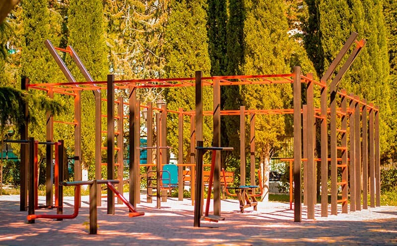 Игровая площадка для детей с безопасным покрытием оборудована качелями, горками, каруселями, игровыми площадками и спортивными комплексами.